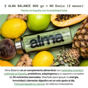 El Batido Alma Balance es un complemento alimenticio en polvo diseñado para concentrar en una sola toma diaria los nutrientes clave que tu cuerpo necesita, con respaldo científico. Este pack contiene 600 g (60 dosis), equivalente a dos meses completos