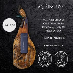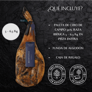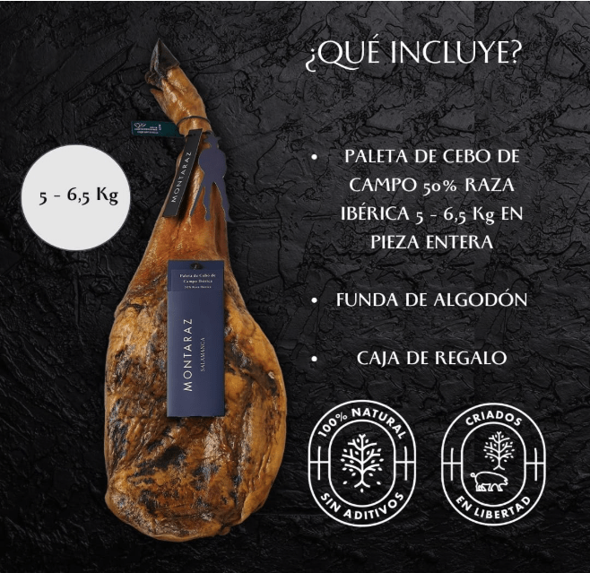 Paleta de Cebo de Campo 50% Raza Ibérica Montaraz, de cerdos criados en libertad en Extremadura y curados en Salamanca, un clima más suave que le otorga un sabor suave y elegante. Paleta100% natural, sin conservantes ni aditivos, sólo carne y sal.