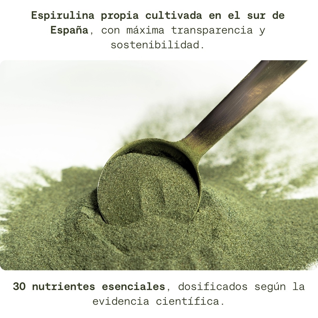 🇪🇸 ESPIRULINA CULTIVADA EN ESPAÑA – Fórmula con 30 nutrientes esenciales y espirulina premium cultivada en el sur de España con trazabilidad total. 300 g = 30 dosis (1 mes). Sin rellenos innecesarios.