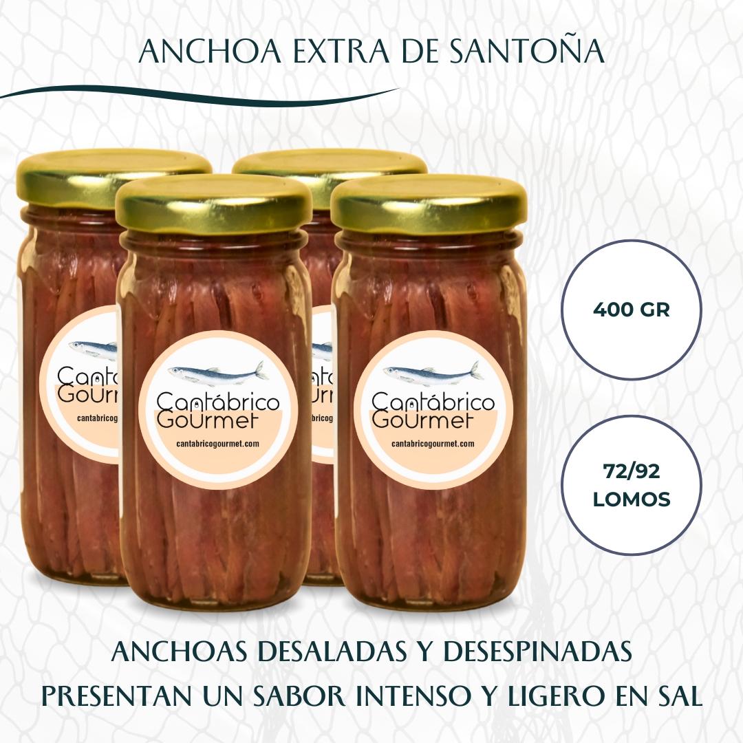 Anchoas de Santoña Extra | 64-80 Lomos de Anchoas del Cantábrico (400gr) en tarro de cristal | Sabor Intenso Ligero en Sal | Elaborado por Casa Santoña