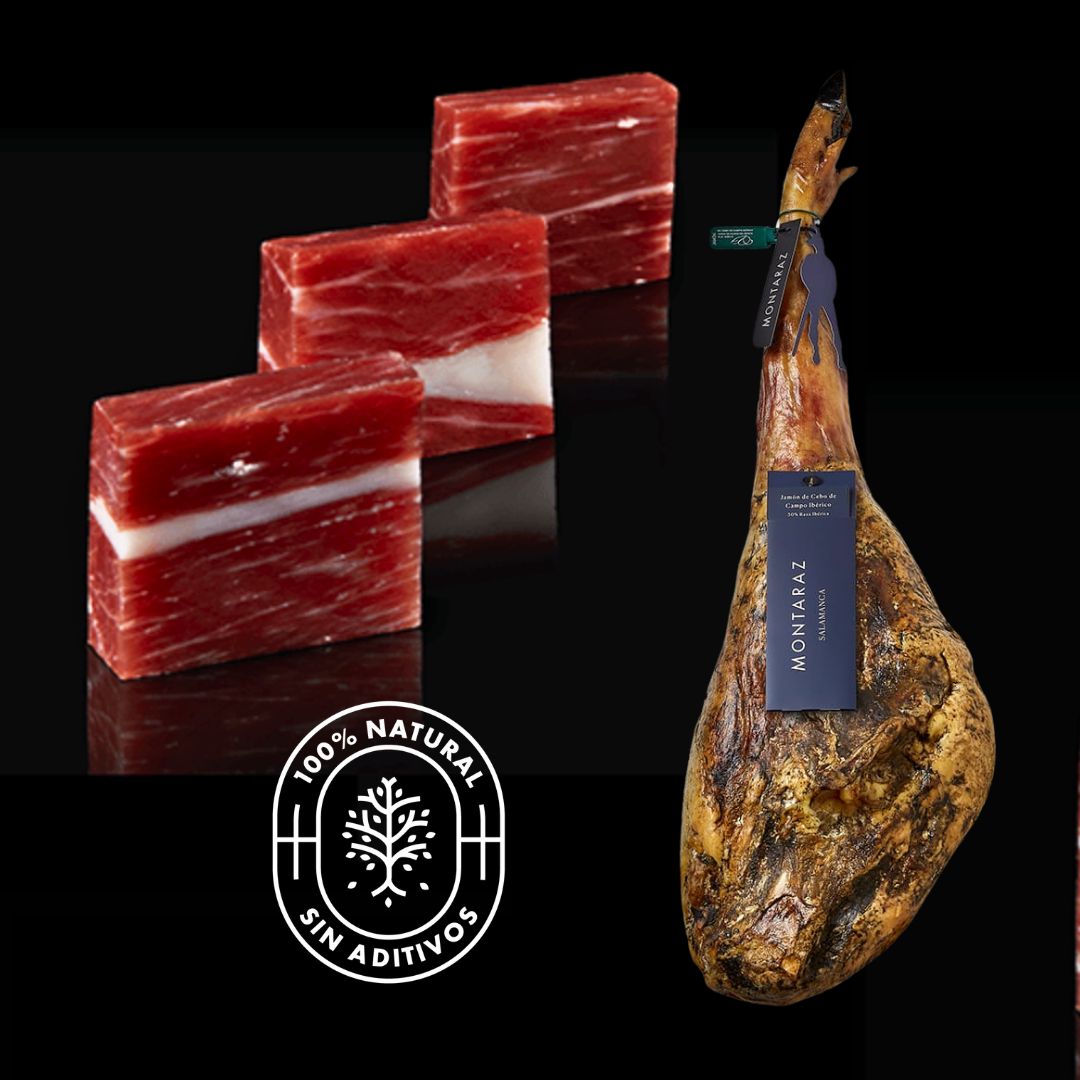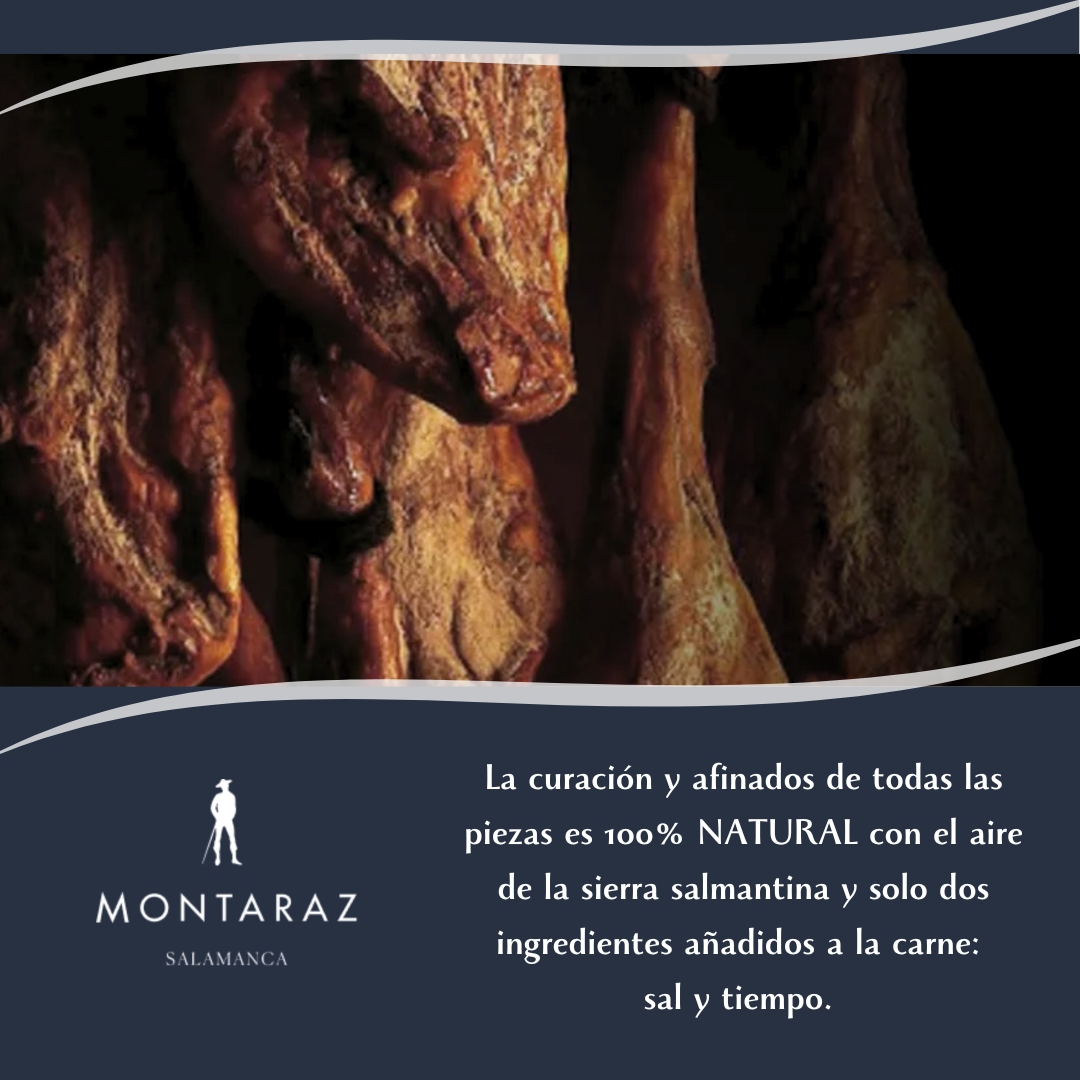 Jamón 50% Raza Ibérica de Cebo de Campo Montaraz, de cerdos criados en libertad en Extremadura y curados en Salamanca, un clima más suave que le otorga un sabor suave y elegante. Jamón 100% natural, sin conservantes ni aditivos, sólo carne y sal.
