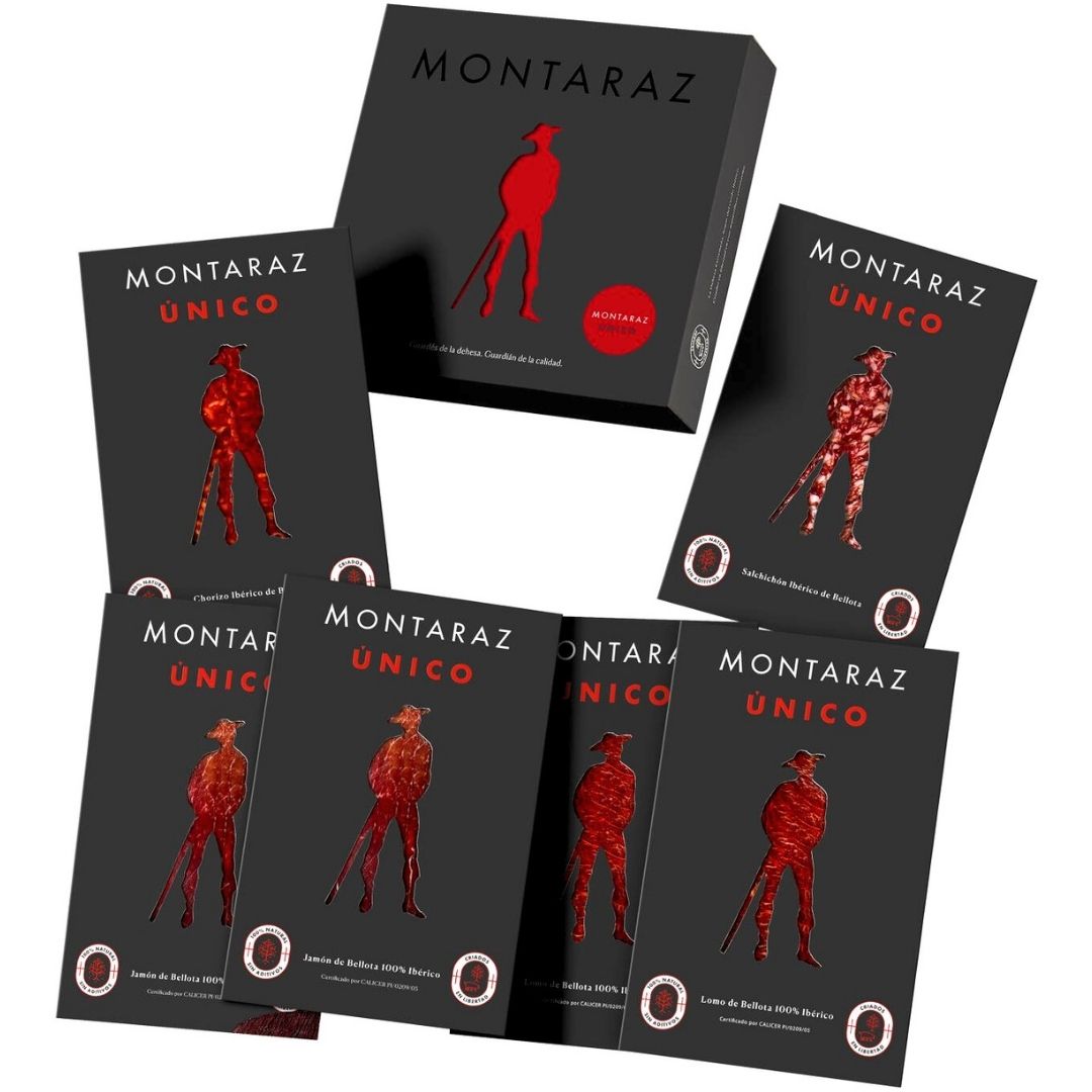 Pack completo con 6 loncheados surtidos 100% bellota, de Jamón Ibérico, Lomo Ibérico, Salchichón Ibérico y Chorizo Ibérico, de 100 gr cada uno, curado en Salamanca y de cerdos criados en libertad en Extremadura. 100% natural, sin aditivos.