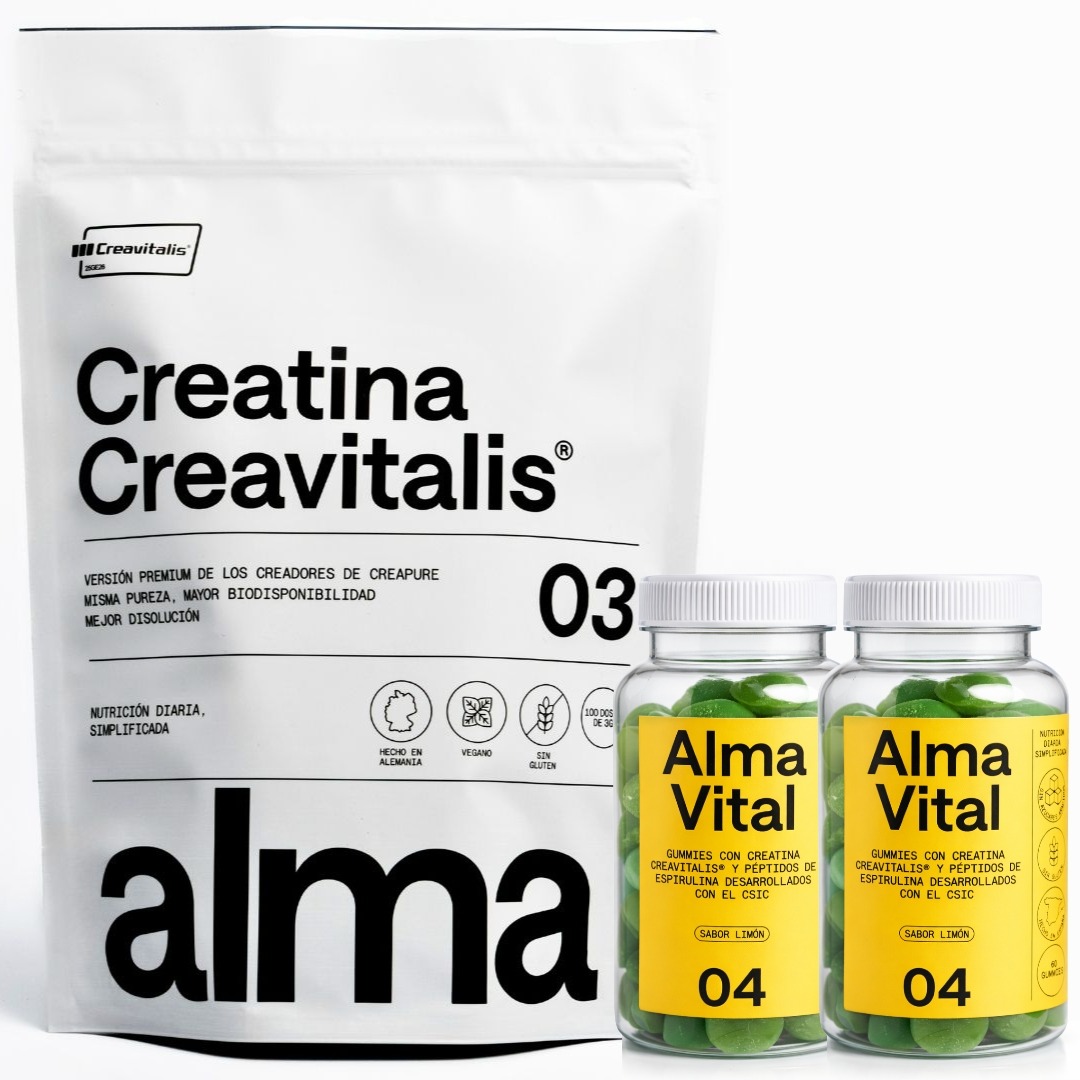 Pack de Creatina Monohidratada Creavitalis® ALMA de 300 g y Gominolas de Creatina Creavitalis®, Vitamina D3 y Espirulina Hidrolizada.