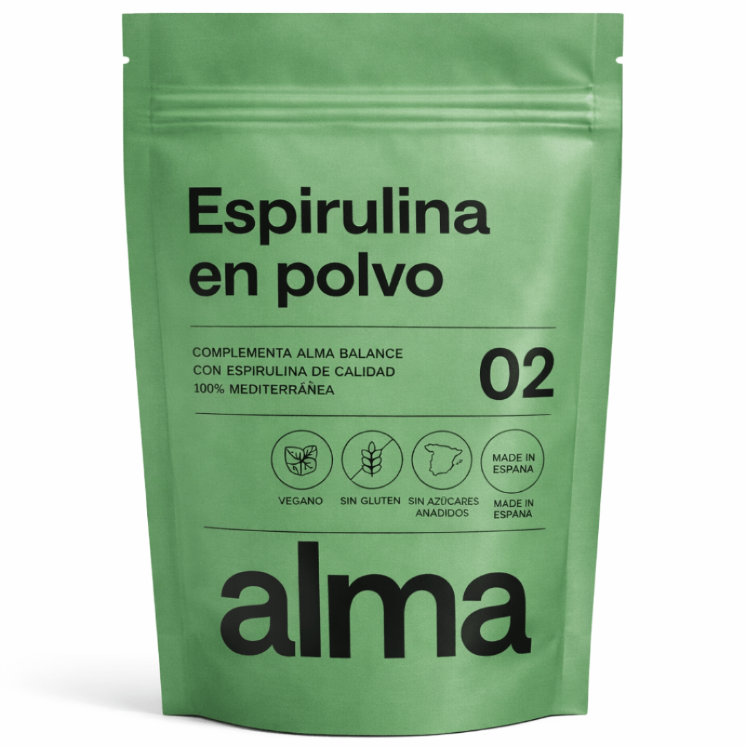 Espirulina 100% pura en polvo ALMA. Superalimento de origen natural en formato polvo, solo espirulina, sin aditivos ni rellenos. Disolución instantánea y sin sabor a alga. Perfecta para quienes buscan un ingrediente único para complementar su alimentación y recetas.